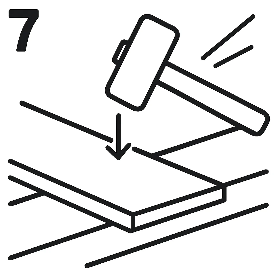 Utiliza un martillo de goma para dar pequeños golpes y asegurar uniones firmes y estéticas, disimulando la línea entre tablones.