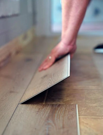 El sistema machihembrado permite instalar sin adhesivos. Une los tablones a través del clic, inclinando ligeramente y presionando hacia abajo hasta escuchar que encajan perfectamente.