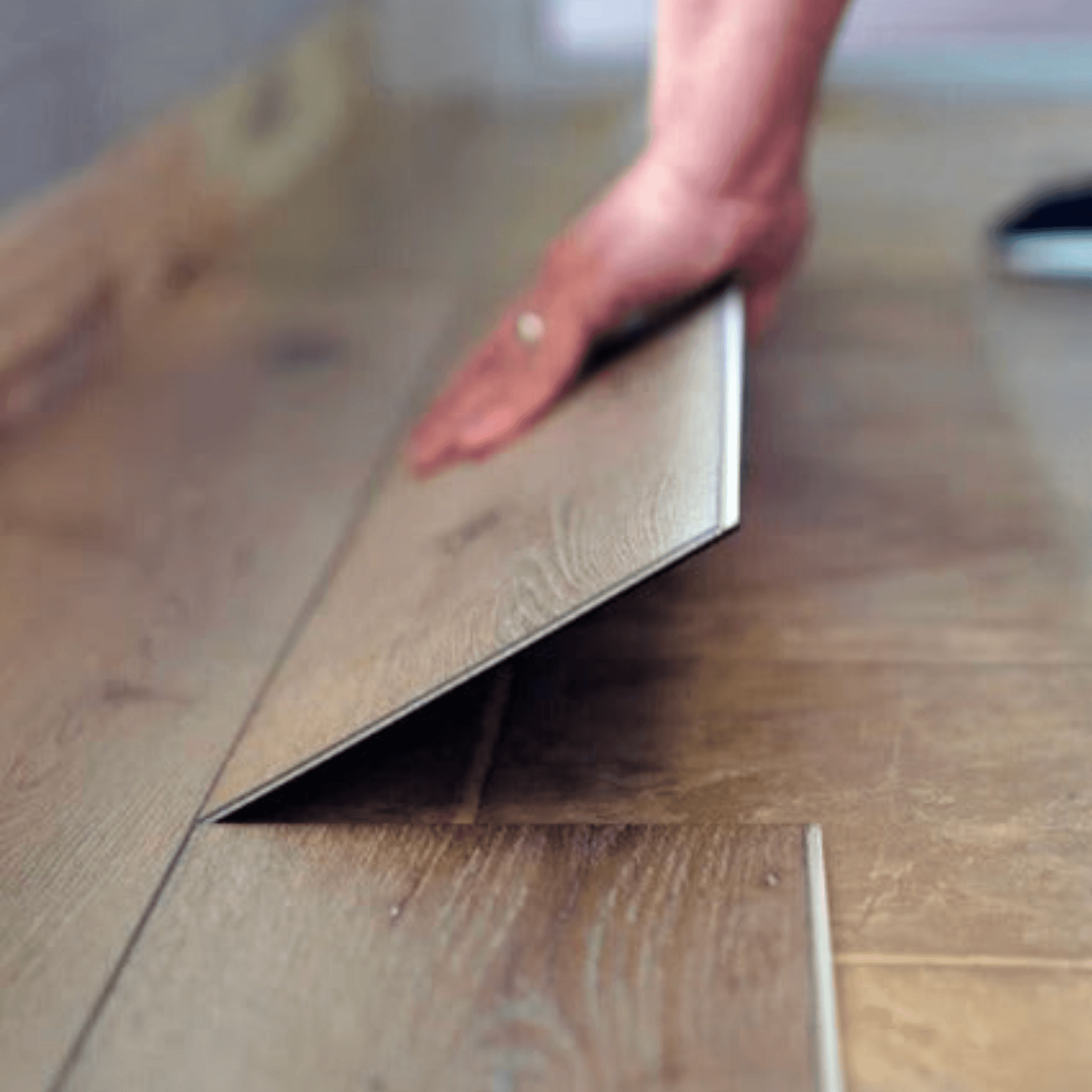 El sistema machihembrado permite instalar sin adhesivos. Une los tablones a través del clic, inclinando ligeramente y presionando hacia abajo hasta escuchar que encajan perfectamente.