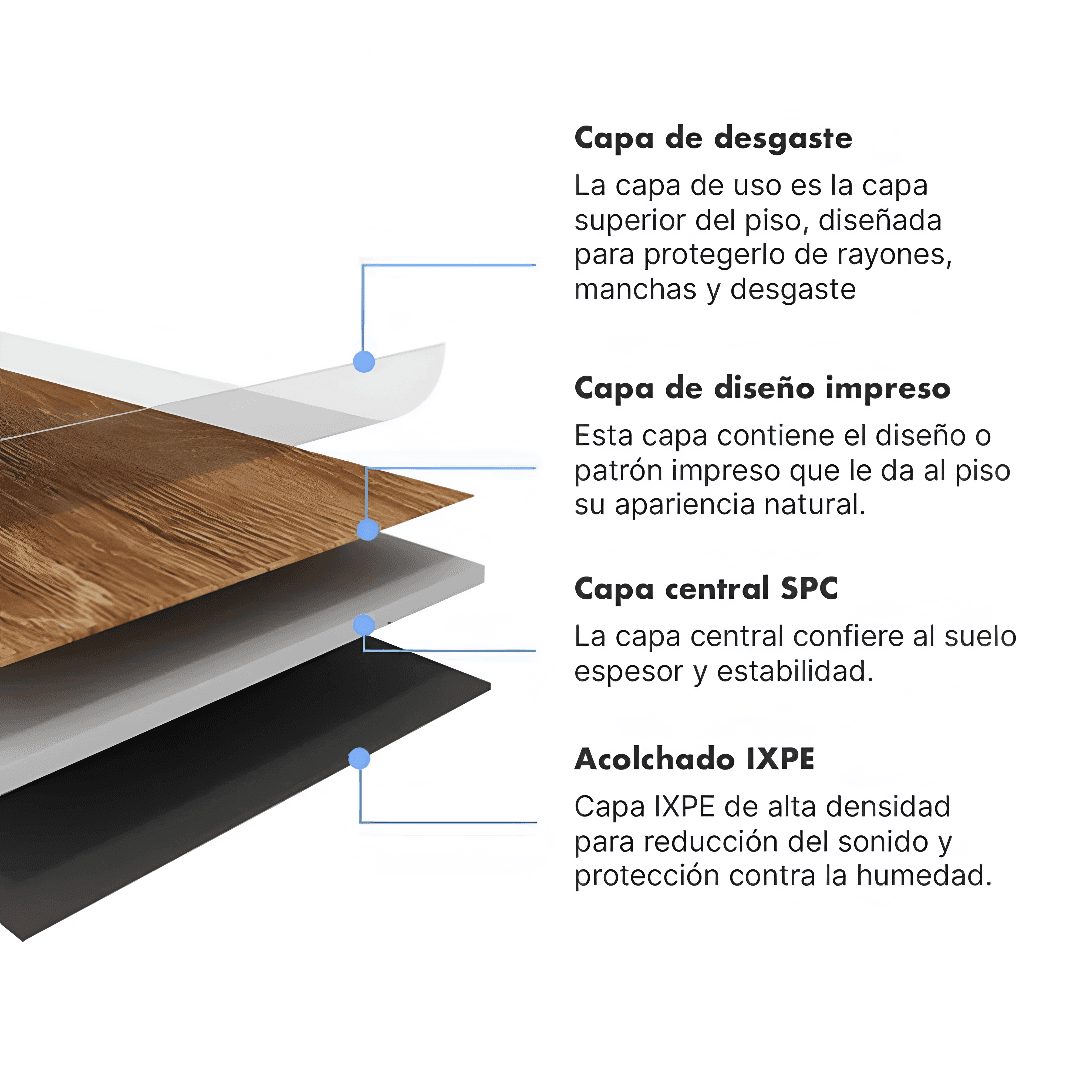 Nuestro piso vinílico SPC (Stone Plastic Composite) es una excelente opción para quienes buscan resistencia, diseño y facilidad de instalación en un solo producto. Su estructura rígida ofrece mayor estabilidad y durabilidad frente al uso diario.
